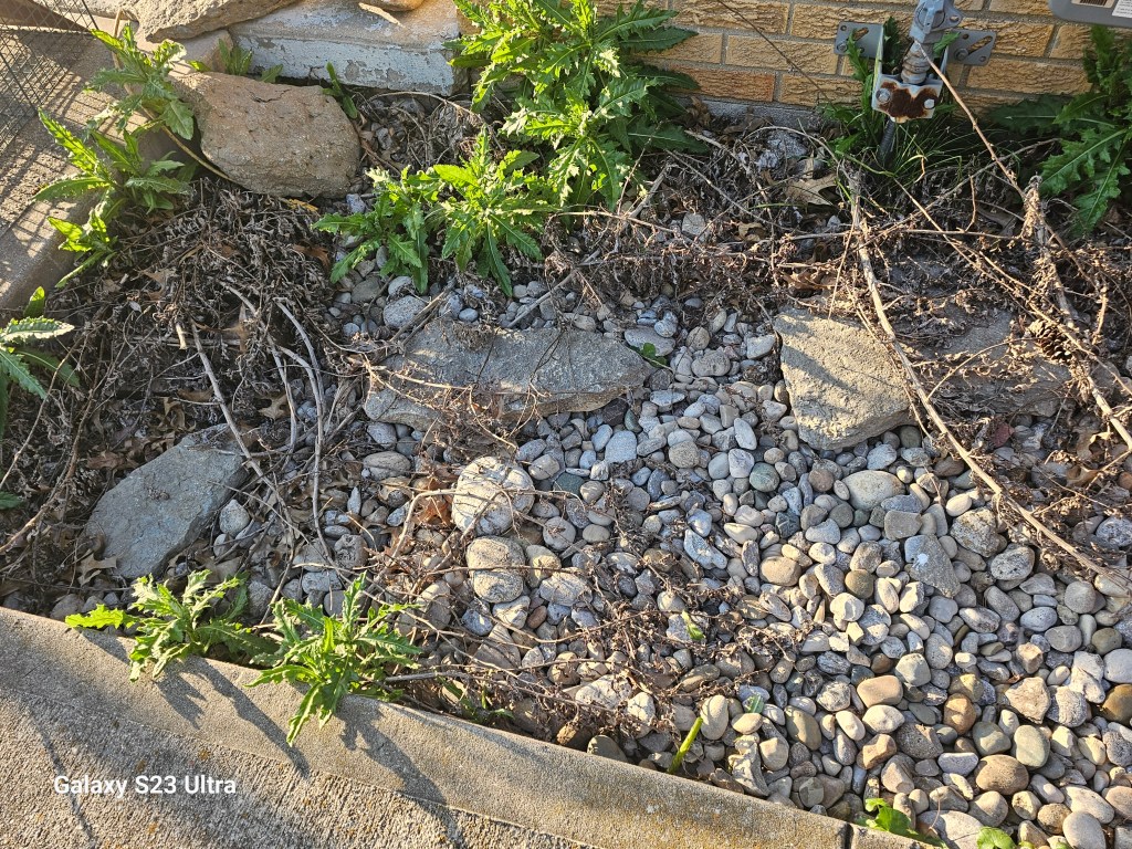 I still have my dirt patch that constantly needs weeds pulled. Now I’ve filled it in with rocks though because my black thumb killed the plants that once lived there. Yet no matter what I do, weeds love to grow in that spot.